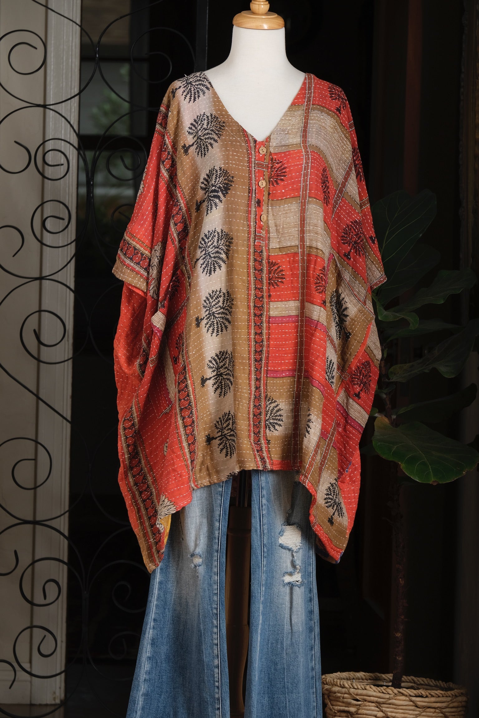 Kantha Button Top in Black Tree